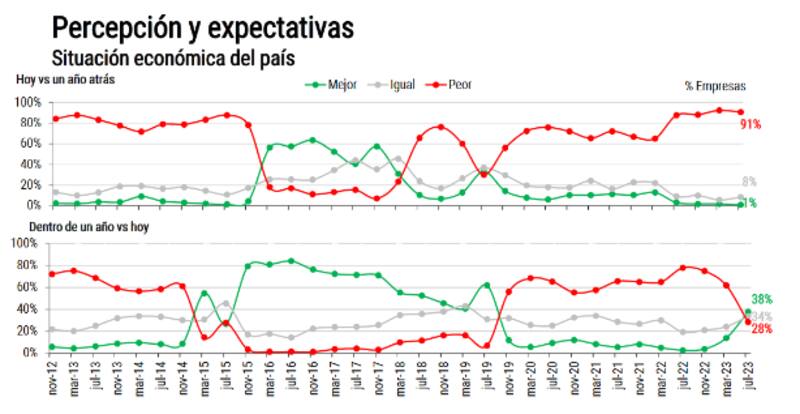 Respecto a la situación económica y financiera de las empresas, el 65% de los consultados respondió que se encuentra peor respecto de un año atrás, aunque las expectativas de una recomposición en el próximo año también mejoraron en este caso.