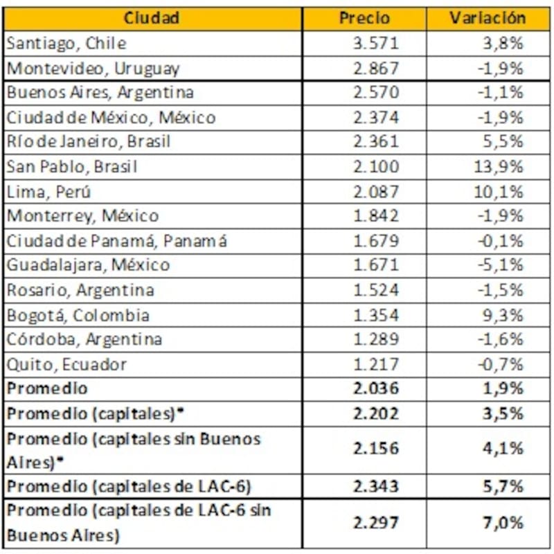 El relevamiento informa el precio del metro cuadrado de departamentos en barrios de 14 ciudades de 9 países de América Latina que son comparables a lo que en Buenos Aires son Barrio Norte, Belgrano, Caballito y Recoleta.