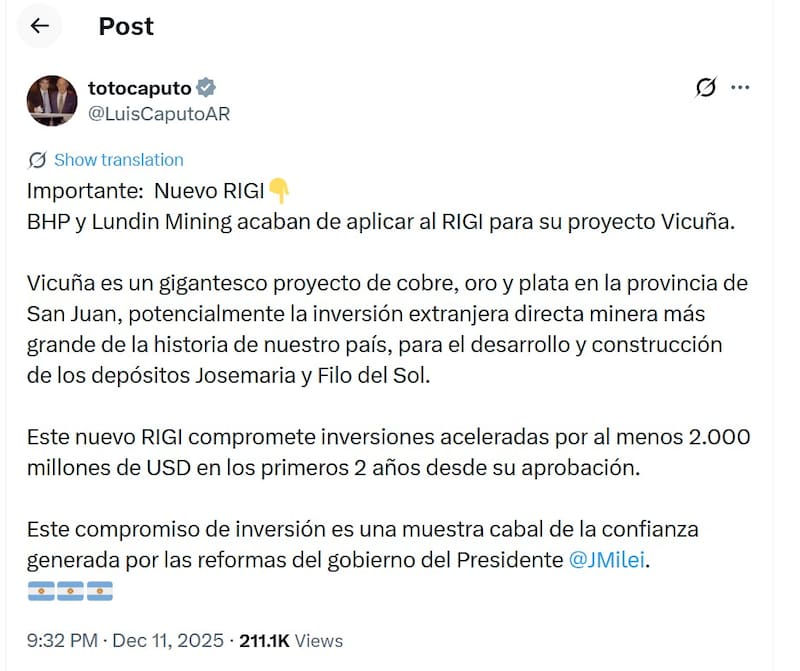 “Nuestra solicitud al RIGI refleja tanto la magnitud de la inversión requerida para el Proyecto Vicuña como nuestra confianza en la Argentina como socio de largo plazo. Valoramos la colaboración permanente con nuestros grupos de interés y con los gobiernos federal y provincial; creemos que el RIGI ofrece un marco estable que acompaña un desarrollo responsable y beneficios económicos compartidos”, afirmó Ron Hochstein, CEO de Vicuña.