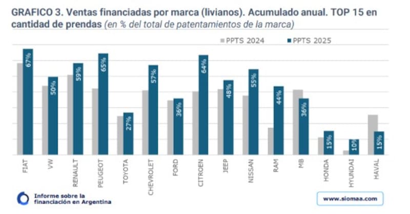 La marca que más autos financiados vendió dentro de sus ventas totales fue Fiat, con el 67% de vehículos comercializados con crédito. Junto con Peugeot (65%) y Citroen /64%) fueron las tres marcas que superaron el 60% de prendas sobre sus ventas.