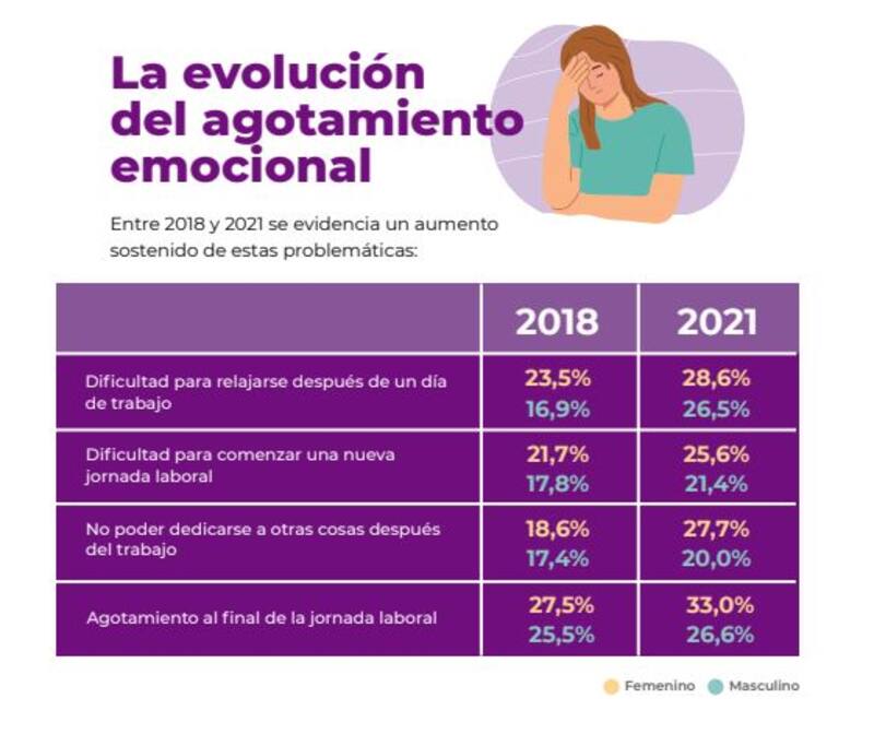 A su vez, el informe analizó la evolución del agotamiento emocional entre entre 2018 y 2021, tomando de referencia al estudio "Índice interanual de bienestar y estrés en los trabajadores argentinos", que demostró una tendencia en aumento en la prevalencia de los síntomas de agotamiento emocional tanto en hombres como en mujeres. Así y todo, el fenómeno se da con mayor notoriedad en las mujeres,