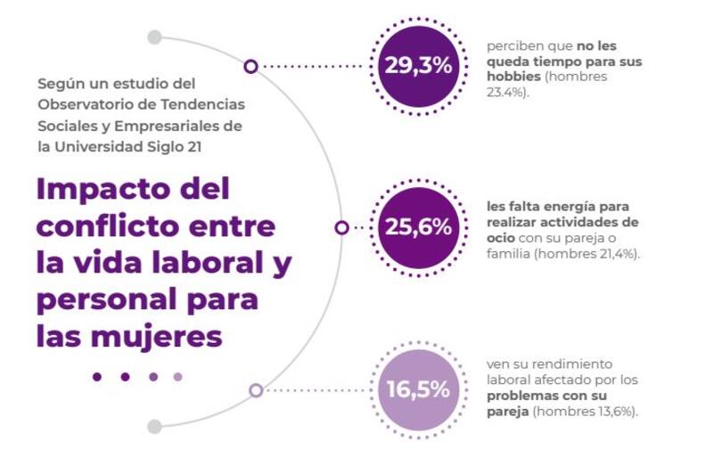 Como consecuencia del homeoffice por la pandemia, las mujeres se sienten más agobiadas y con menos tiempo para el ocio que los hombres.Así lo asegura un estudio que realizó la Universidad Siglo 21, a través de su Observatorio de Tendencias Sociales y Empresariales, con motivo del Día de la Mujer.Así, se acentuaron problemáticas que se observaban ya antes del Covid-19.