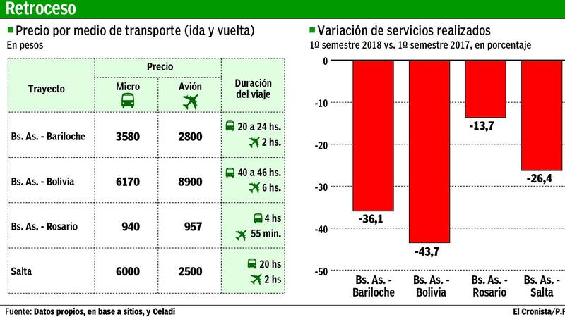 Por ejemplo, en el primer semestre, los viajes realizados entre Buenos Aires y Bariloche se redujeron un 36,1%, frente a igual período de 2017. Los precios no son ajenos a esa disminución. Un pasaje en micro entre ambas ciudades cuesta desde $ 3580 ida y vuelta, en un recorrido de 20 a 24 horas de duración. En avión, en cambio, se consiguen pasajes desde $ 2800 ($ 780 menos), por un viaje de sólo dos horas.