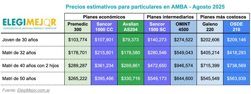 El plan familiar más barato (para un matrimonio con dos chicos) que se muestra en ElegiMejor.com.ar es el de Premedic 200, un plan básico que cuesta $ 175.000. Entre los convenientes, la plataforma muestra el de SanCor Salud 1500 B, de $ 397.000, que incluye odontología, reintegros y cobertura internacional.