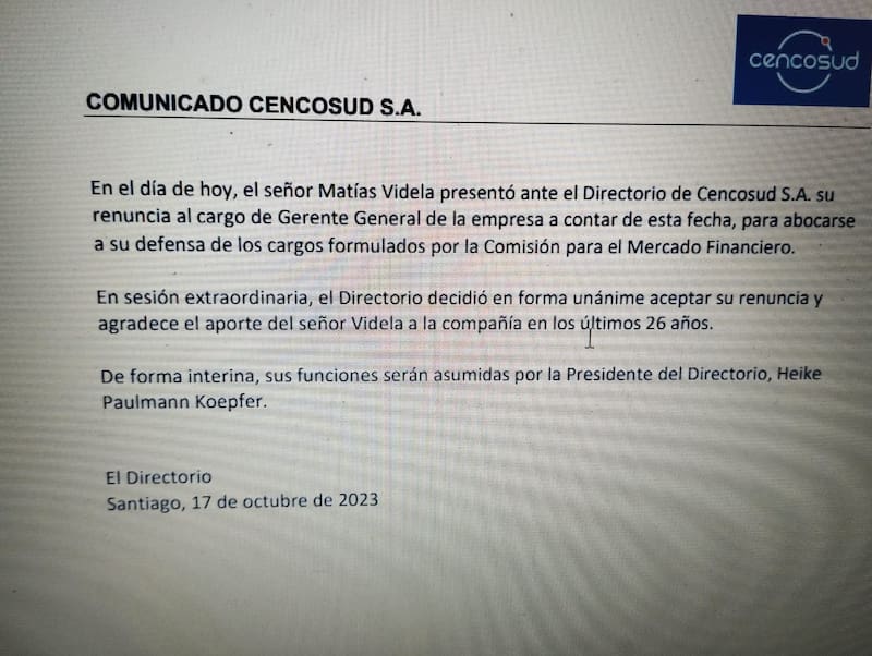 Así este martes, tras la renuncia, Cencosud dijo en un comunicado: "El señor Matías Videla presentó ante el directorio de Cencosud S.A. su renuncia al cargo de gerente general de la empresa a contar de esta fecha, para abocarse a su defensa de los cargos formulados por la Comisión para el Mercado Financiero".