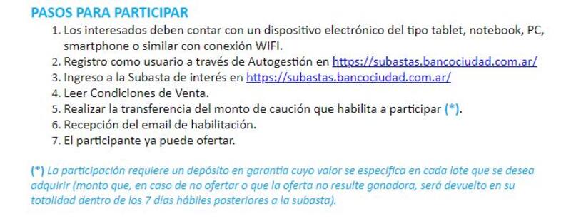 "Cada oferente podrá realizar la cantidad de ofertas que considere necesarias hasta tanto resulte adjudicatario o sea superada, durante el plazo de duración de la subasta pública", destacó el Banco Ciudad. A su vez, indicó que un mismo oferente podrá realizar más de una oferta para el mismo bien y prevalecerá la de mayor valor.