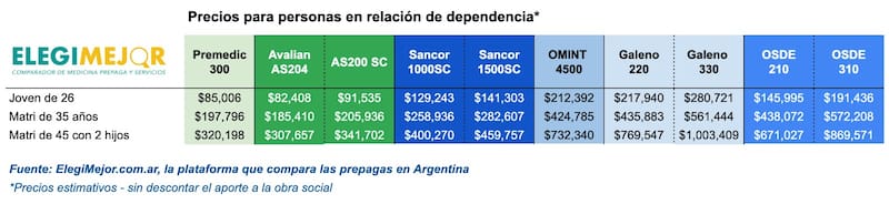 Dentro del universo de planes disponibles, los más accesibles siguen concentrando en opciones de entrada de compañías como Premedic, Avalian y Sancor Salud. Según datos de ElegiMejor.com.ar, la plataforma que compara los precios de las prepagas, en abril de 2026 los valores de referencia para una persona joven parten de: