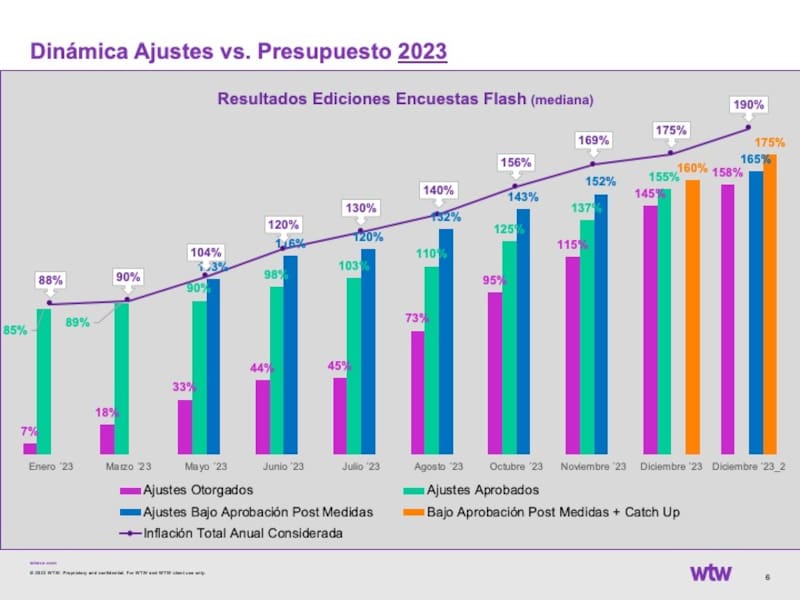 "Todo indicaba que los ajustes salariales del año 2023 para el personal fuera de convenio ya estaban casi cerrados, si pensamos en lo que las empresas aplicaron durante los 12 meses del año calendario. Pero claramente muchas de ellas, automáticamente que se lanzaron las medidas económicas del nuevo gobierno, ya tenían en su plan mejorar los ajustes planificados para el mes de diciembre. De esta manera en promedio las compañías que tenían previsto otorgar un 156% (acumulado anual) y pasaron a 165,5%", detalló Marcela Angeli, directora de Work & Rewards de WTW.