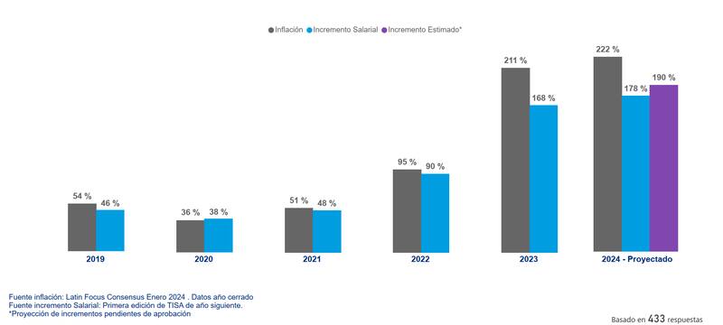 "Existe una gran incertidumbre en el mercado en cuanto a las estimaciones de inflación, devaluación y posibles impactos de las medidas previstas para 2024, lo que obliga a los responsables de las políticas de compensaciones a gestionar las aprobaciones internas necesarias para contemplar un escenario de incrementos anuales del 190%, es decir, un 12% más del total aprobado para el año, siguiendo la mediana arrojada por la encuesta", destacó el experto de Mercer.