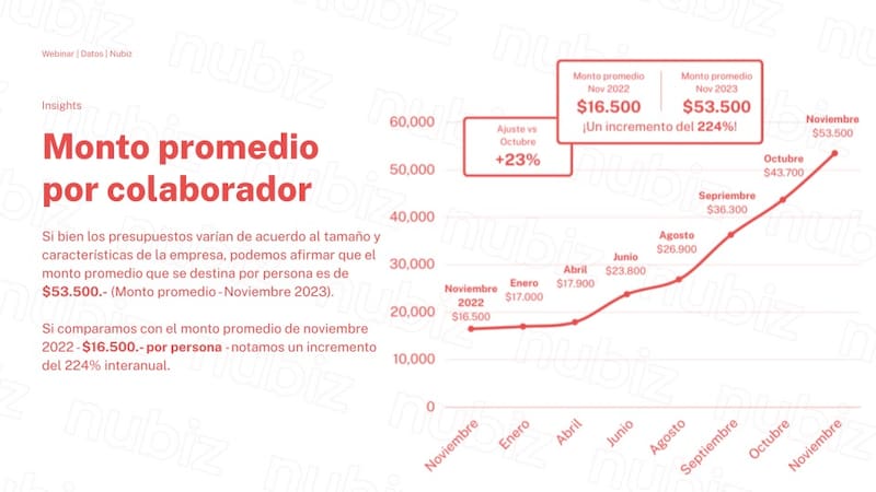 Al respecto, según números relevados por Nubiz, la tarjeta prepaga de beneficios que permite a los empleados gasta el dinero en lo que ellos prefieran, en noviembre las empresas aumentaron un 224% el monto que le dieron a sus colaboradores, en promedio, en comparación con noviembre de 2022.