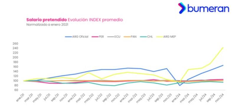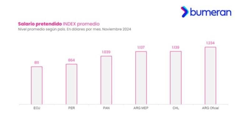 Desde 2020, Argentina registra las mayores fluctuaciones de la región en las remuneraciones solicitadas tanto en dólar MEP como oficial. En dólar MEP se observa un incremento del 117.68%, en dólar oficial del 46.23%. En Chile se ha registrado un aumento en el salario pretendido promedio del 10.53%; en Perú del 1.52%; en Panamá del 1.48%; y en Ecuador del 0.56%.
