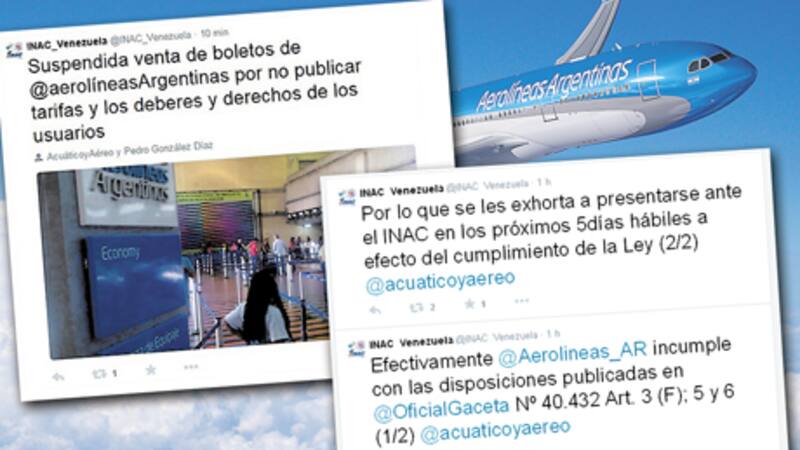 El Instituto Nacional de Aeronáutica Civil de Venezuela (INAC) informó ayer, a través de su cuenta de Twitter, que quedó "suspendida (la) venta de boletos de @aerolíneasArgentinas por no publicar tarifas y los deberes y derechos de los usuarios". La información fue desmentida a El Cronista por la línea de bandera argentina al aducir que no comercializa pasajes en esa terminal aérea, pero fue confirmada también a este diario por el INAC.