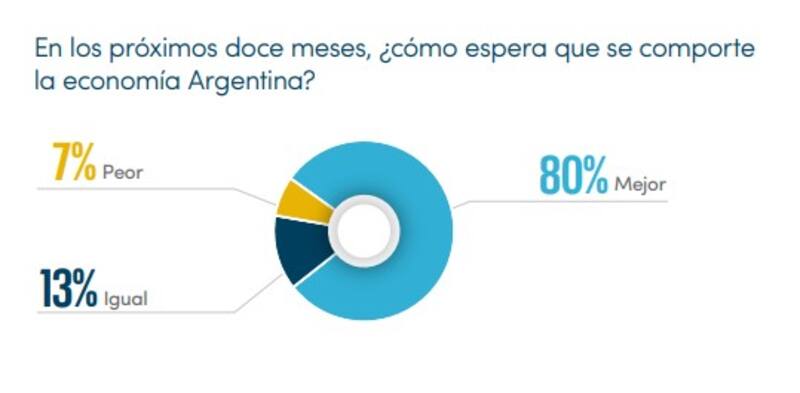En cuanto a el futuro, el 80% estimó que en los próximos 12 meses la el escenario económico argentino mejorará. El 13% señaló que no habrá cambios y el 7% consideró que empeorará.
