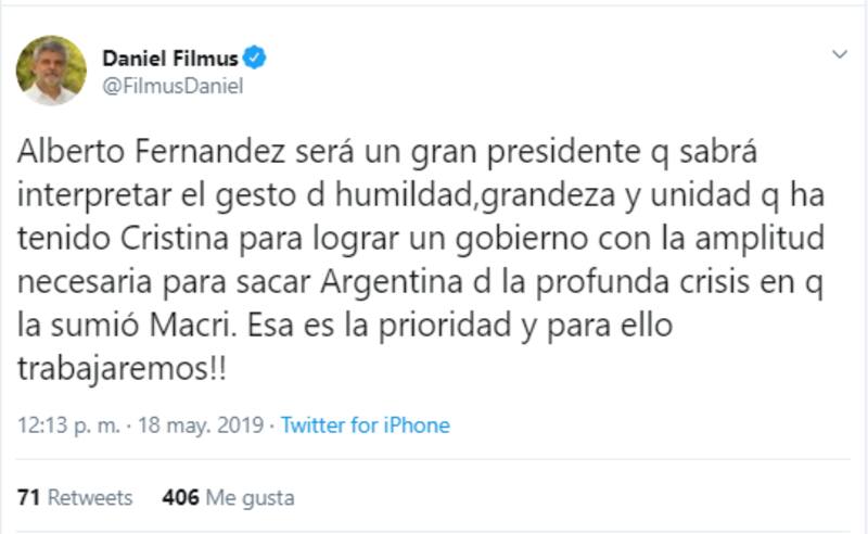 "Cristina muestra una vez más su liderazgo, compromiso, coraje y amor por el pueblo. Damos otro paso en la unidad del peronismo para triunfar en las urnas y reconstruir el país. Alberto Fernández y Cristina pueden y saben hacerlo. A militar con alegría en cada rincón de la Patria!", escribió en Twitter el presidente de la Cámara de Diputados de Entre Ríos y ex gobernador Sergio Urribarri.