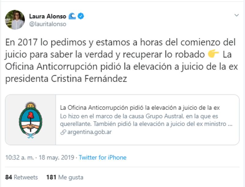 Finalmente, Laura Alonso, que está al frente de la Oficina Anticorrupción, no mencionó la candidatura pero recordó: "En 2017 lo pedimos y estamos a horas del comienzo del juicio para saber la verdad y recuperar lo robado La Oficina Anticorrupción pidió la elevación a juicio de la ex presidenta Cristina Fernández".