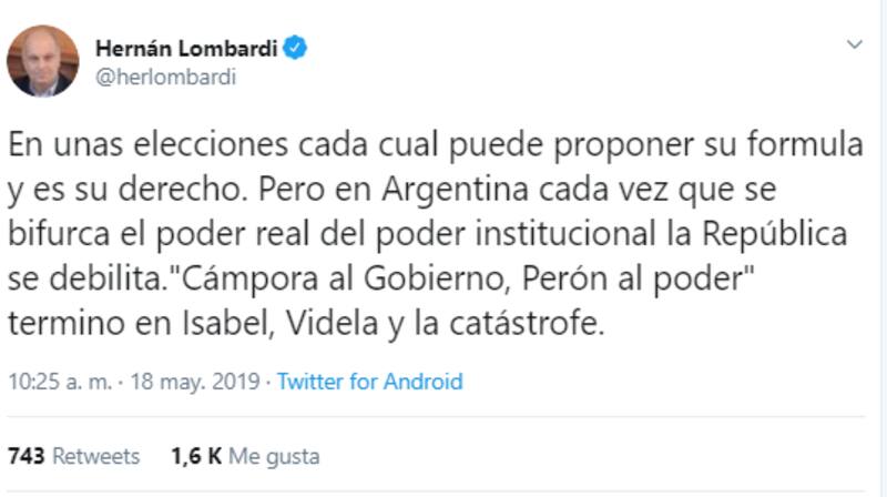 Por su parte, el titular del Sistema Federal de Medios y Contenidos Públicos, Hernán Lombardi, publicó su opinión y relacionó la jugada con la candidatura de Héctor Cámpora en 1973, bajo el paraguas de Juan Perón como garantía de los votos.: "En unas elecciones cada cual puede proponer su formula y es su derecho. Pero en Argentina cada vez que se bifurca el poder real del poder institucional la República se debilita. 'Cámpora al Gobierno, Perón al poder' termino en Isabel, Videla y la catástrofe".