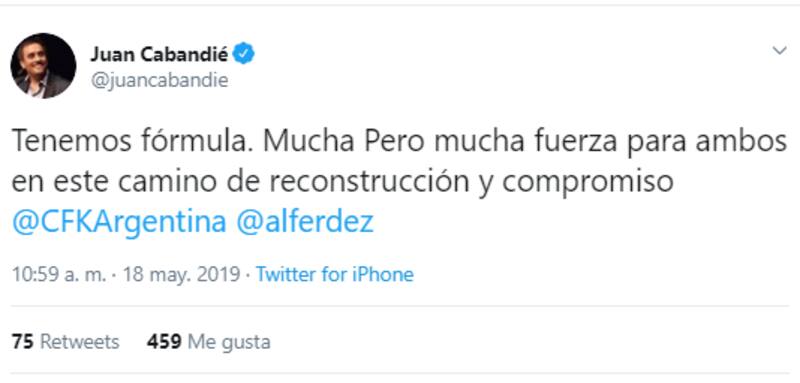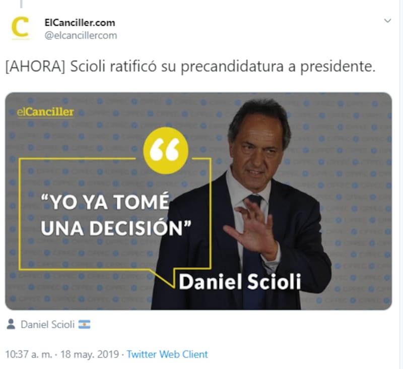Y el ex gobiernador Daniel Scioli, que perdió las elecciones frente a Mauricio Macri en 2015, reafirmó su intención -a través de un retuit- de presentarse como candidato a presidente, más allá de la nueva formúla kirchnerista-peronista.