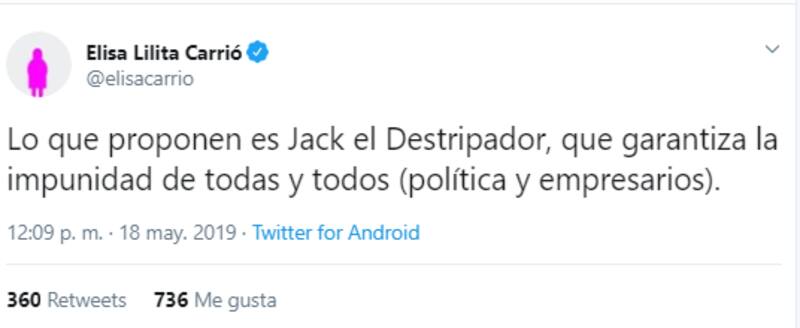 Desde la vereda contraria, Elisa Carrió se refirió a la novedad sin indicarlo directamente. "Lo que proponen es Jack el Destripador, que garantiza la impunidad de todas y todos (política y empresarios)", escribió.