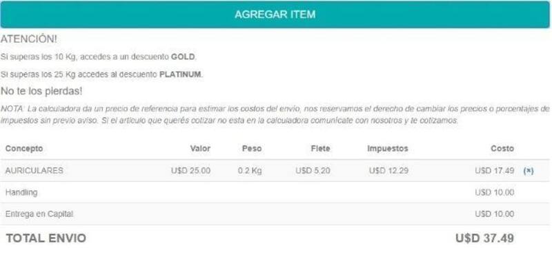Los límites para compras siguen siendo los mismos que a través de otros servicios como el Puerta a Puerta del Correo: se pueden realizar hasta 5 envíos años año, con un tope de u$s2.500. Asimismo, el límite es de 50 kilos por compra. En el resumen de la tarjeta del comprador se refleja el mismo importe en dólares (está incluido el impuesto del 35%) que muestra la plataforma al hacer el checkout.