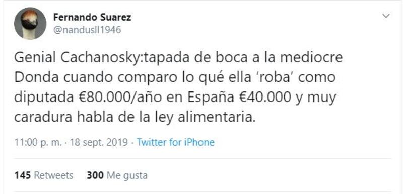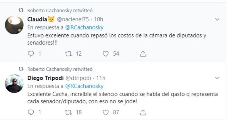 Luego el economista explicó que el presupuesto de senadores corría por similar suerte. "Cada senador vale 171.000 euros mensuales contra 17.500 euros que te cuesta un senador en España", dijo el economista, ante una mesa que quedó muda. Luego de unos instantes, Victoria Donda atinó a decir que no se sentía incluida por la frase "háganse cargo muchachos". Cachanosky, velozmente, corrigió: "Bueno, muchaches". A lo que Donda, que preside el partido Somos que forma parte del Frente de Todos en CABA, atinó a sonreír.