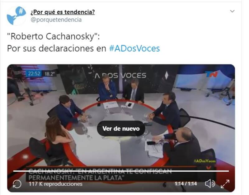 El economista Roberto Cachanosky es un ávido tuitero que en más de una ocasión supo como generar polémica con sus declaraciones. Recientemente, el editor del Informe Económico Semanal, estuvo en el programa A Dos Voces que se emite por la señal TN y allí entabló un debate con la diputada del partido Somos Victoria Donda.