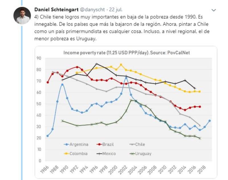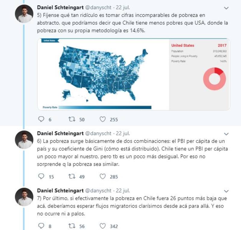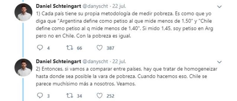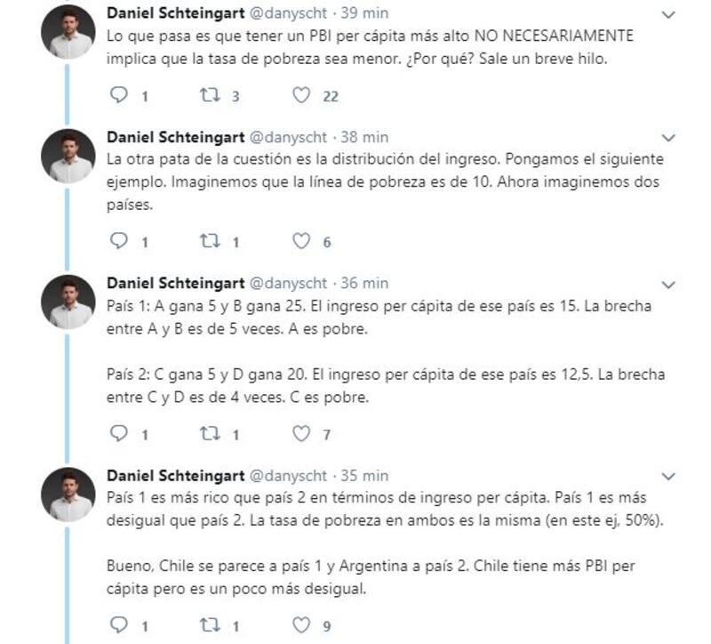 "Mucha gente sigue repitiendo que Chile tiene una pobreza sustancialmente menor a la de Argentina. Esto está mal: la forma de medir pobreza de Chile es recontra diferente a la nuestra y es incomparable", afirmó Daniel Schteingart, quién antes ya había explico el famoso meme de Noruega y el socialismo.