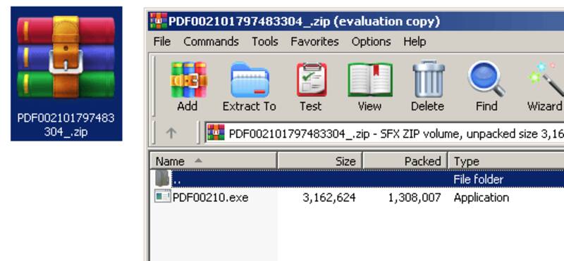 El archivo infectado llega en format de archivo .zip con un nombre que imita a un archivo de texto PDF: