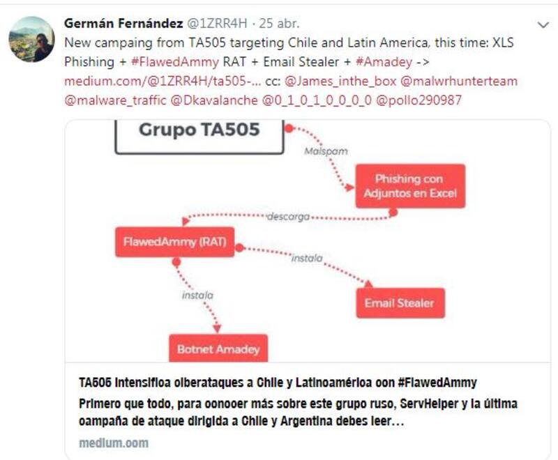 Según la empresa de ciberseguridad ProofPoint, el grupo ruso de ciberdelincuentes llamado TA505, que ha desarrollado malware como son FlawedGrace, FlawedAmmy y ServHelper, se encuentra haciendo campañas de correos electrónicos de phising dirigidos a la Argentina y a Chile. ¿Cuál es la modalidad de estos ataques dirigidos? Se propaga mediante el envío de mails fraudulentos con un archivo adjunto de Word, Excel, PowerPoint o PDF que tiene código malicioso internamente y al ejecutarse este infecta el equipo de la víctima sin que esta se entere.