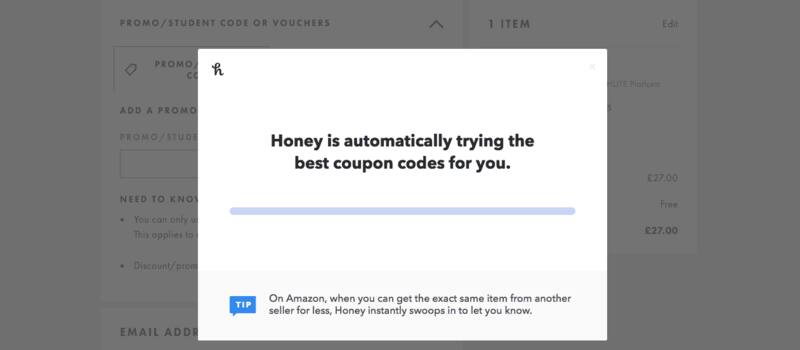 El sistema funciona así: una vez que termine de comprar en un sitio web y finalmente esté en la pantalla de pago, aparecerá una barra lateral con el botón "Probar códigos". Honey empezará a probar los códigos de cupones desde una base de datos. Luego, simplemente, seguirá adelante y los aplicará automáticamente (siempre opta por el que tenga el descuento más alto). Como último paso, la extensión parea el ticket de descuento con la compra y efectiviza los descuentos sobre la compra.