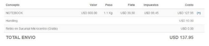 Si se opta por la opción de Puerta a Puerta, al precio final hay que sumarle US$ 142,50 de impuesto por exceder la nómina máxima de US$ 50. Esto asciende el total del producto a US$ 477 lo que en moneda local se traduce a $ 20,816.