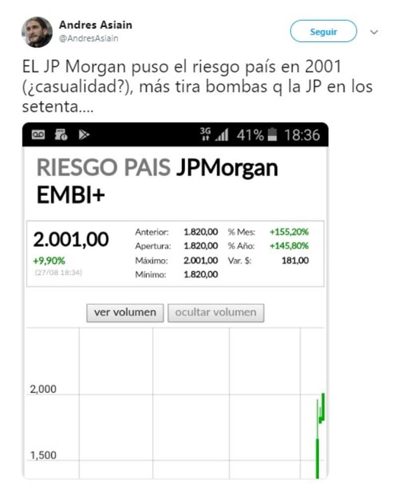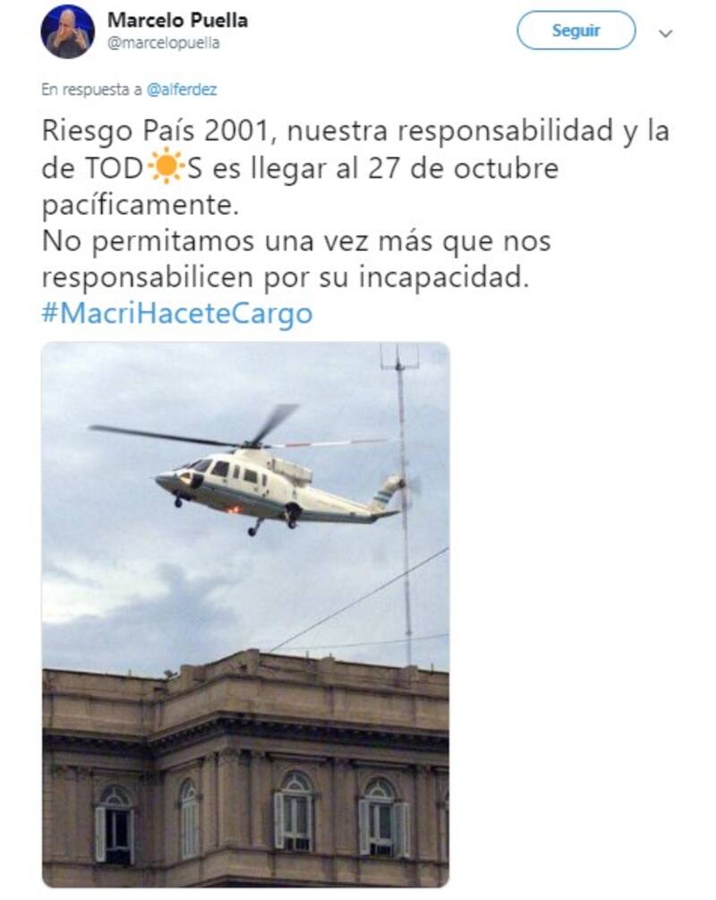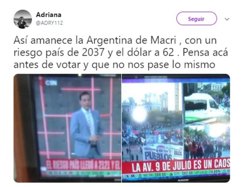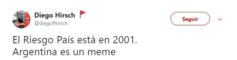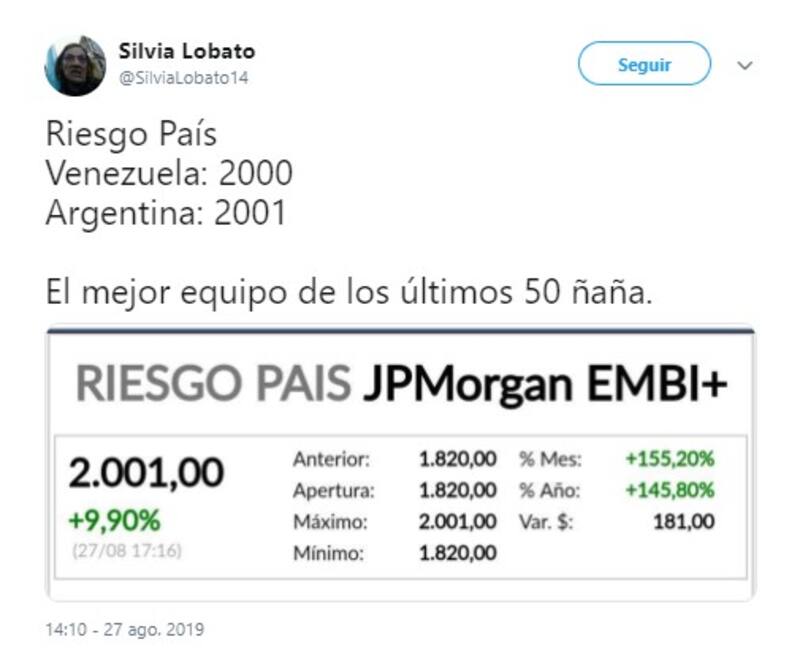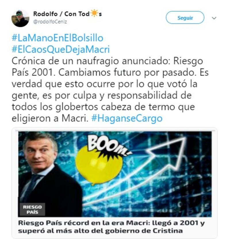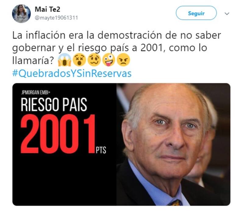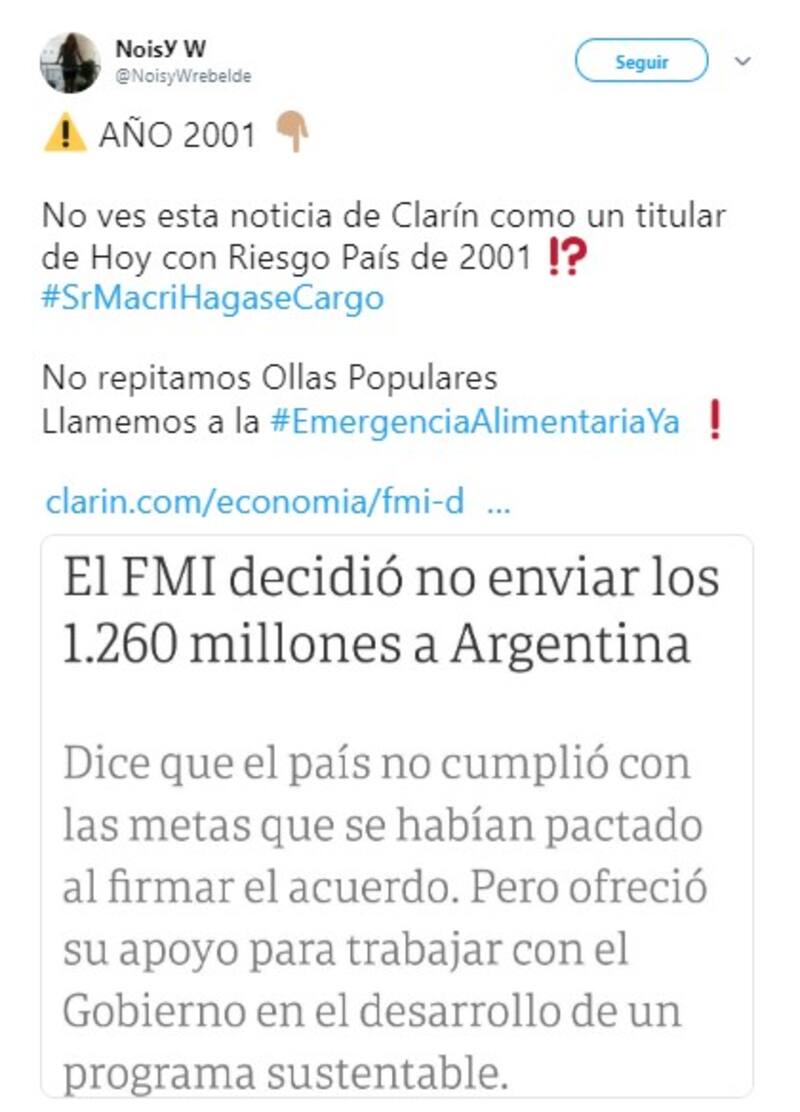 Por otro lado, al referirse al crecimiento del riesgo país, muchos usuarios decidieron comparar la crisis económica de 2001, que desencadenó la renuncia del expresidente Fernando de la Rúa;y culparon al presidente Mauricio Macri, a la gobernadora bonaerense María Eugenia Vidal y a la diputada Elisa Carrió por las medidas económicas adoptadas.