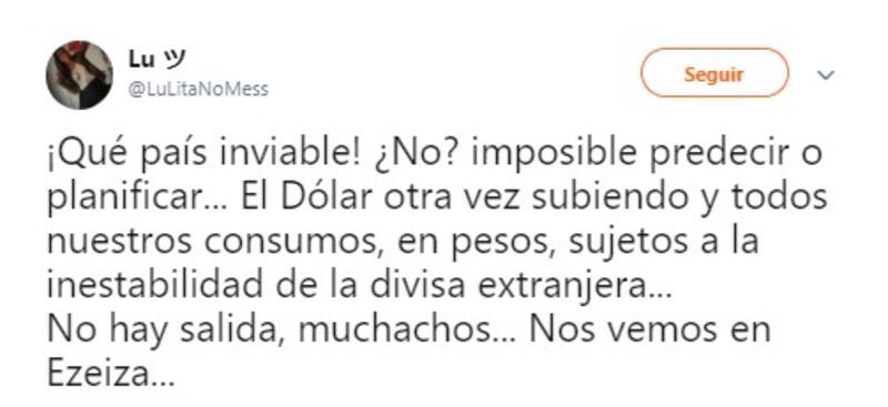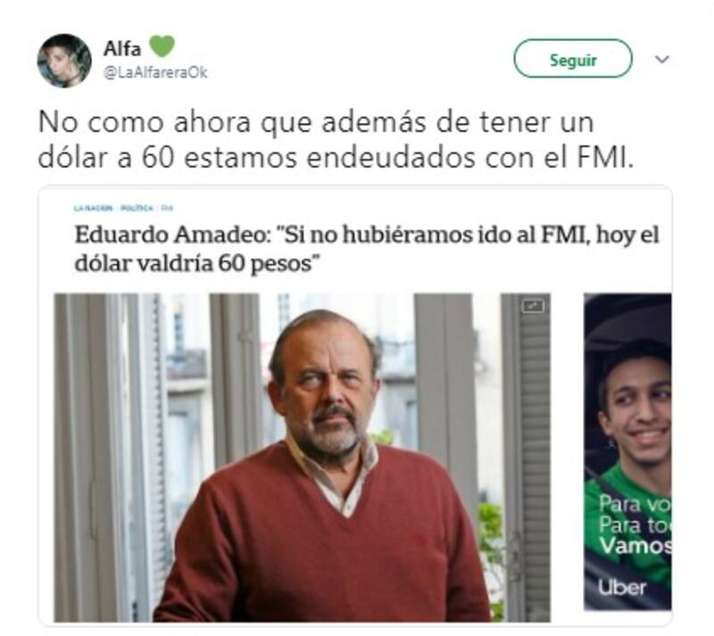 Al referirse al avance del dólar, los usuarios recordaron las palabras del diputado nacional Eduardo Amadeo tras sellar un nuevo acuerdo con el Fondo Monetario Internacional (FMI);desligaron responsabilidad por el nuevo avance del billete al candidato a presidente por Frente para Todos, Alberto Fernández, y resaltaron las complicaciones que generará para la economía del país este nuevo incremento del tipo de cambio.
