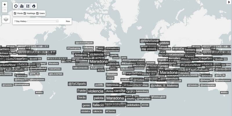 La muerte prematura del ídolo argentino domina la conversación en Twitter, más allá de la imagen en movimiento que muestra el Trendsmap: para verlo, solo hay que hacer clic en la lupa que está arriba a la izquierda del mapa (al lado de las tres líneas horizontales), para ver las palabras claves y los hashtags del momento: la gran mayoría están dominados por Maradona y las expresiones de agradecimiento y dolor por su muerte.