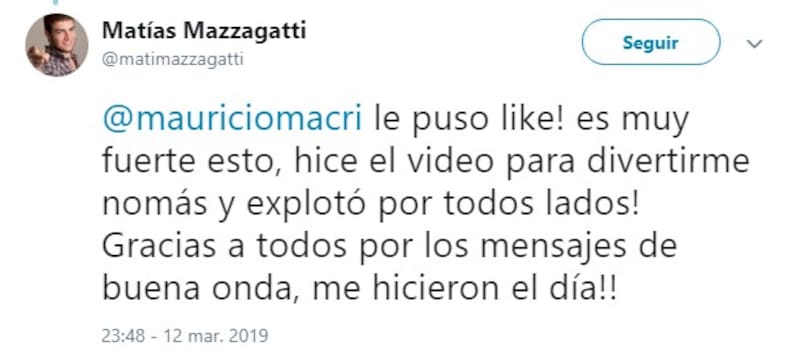 Allí cosechó más de 14.000 retweets y 33.000 Me Gusta, entre los que se destacaba uno muy especial: el del propio presidente. “@mauriciomacri le puso like! es muy fuerte esto, hice el video para divertirme nomás y explotó por todos lados! Gracias a todos por los mensajes de buena onda, me hicieron el día!! , celebró Mazzagatti.