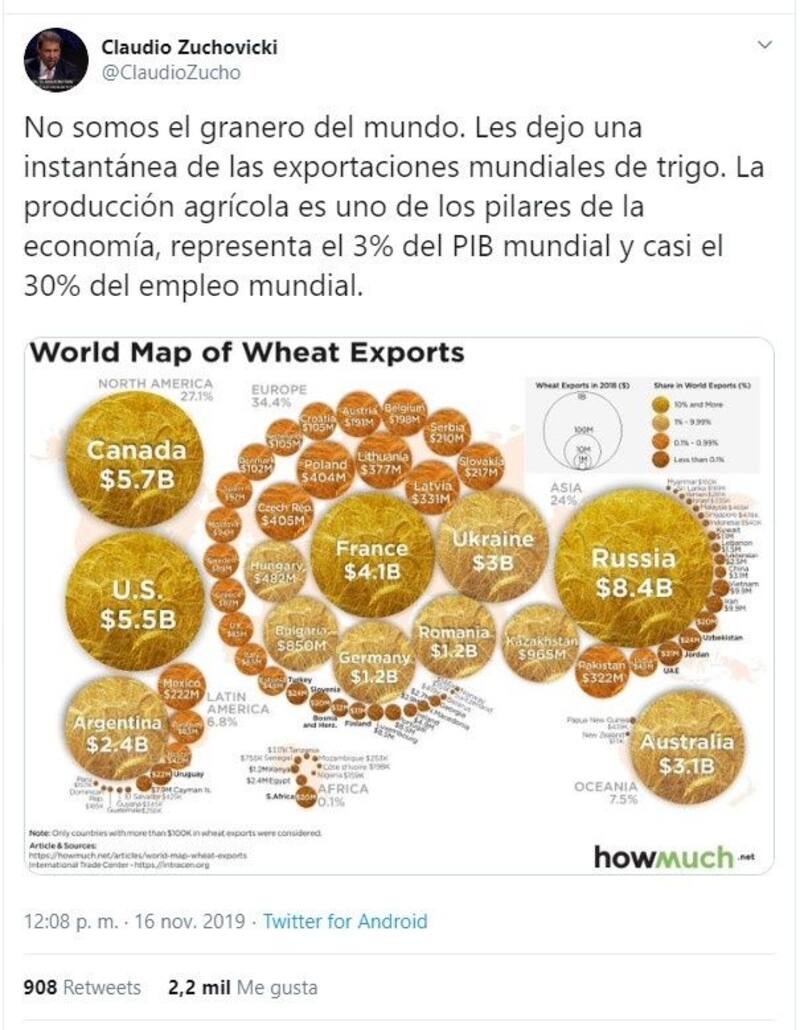En ese posteo, el economista brindó un detalle de las exportaciones mundiales de trigo y la relevancia que posee el país actualmente en el orden mundial.
