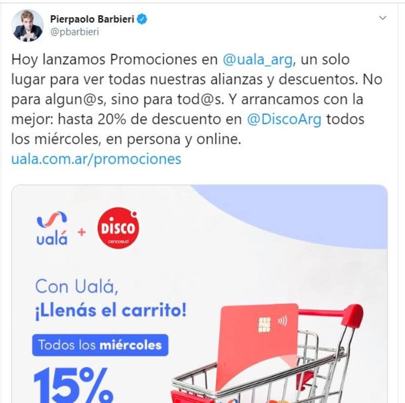 Así lo comunico el fundador de la compañía Pierpaolo Barbieri en sus redes sociales. La promoción no tiene límite de compra y permite acceder a grandes descuentos en compras de diversos tipos. Por caso, la compra de pasajes nacionales en la empresa FlyBondi también tendrán un 15% de descuento. También se ofrecen beneficios para algunos servicios como Cabify ($100 de regalo en los primeros dos viajes) o Rappi ($200 de regalo y envío gratis en el primer pedido).