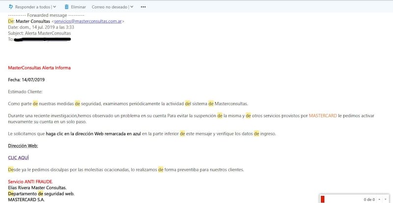 Se trata de un típico caso de phishing, una modalidad de estafa cuyo fin es obtener datos de un usuario (claves, cuentas bancarias, números de tarjeta de crédito).