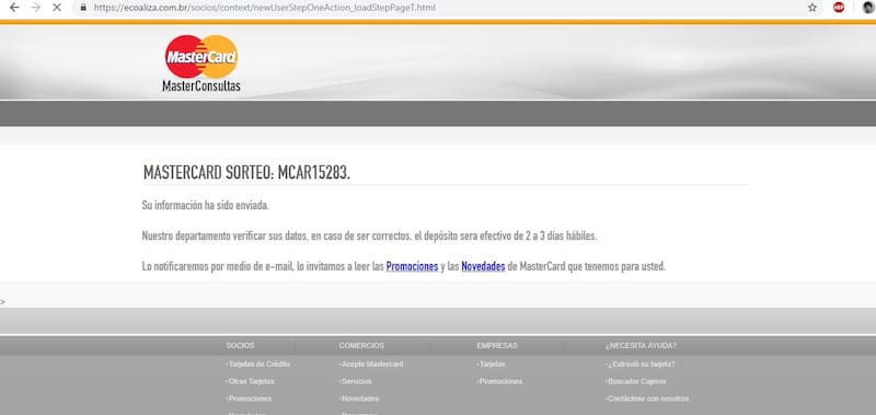 Finalmente, el usuario ve la siguente pantalla donde parece todo estar en orden. A continuación, luego de unos segundos, la página fraudulenta envía a la víctima al sitio original de Mastercard.