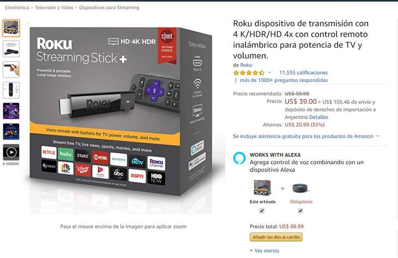 En la misma línea, otro de los productos más vendidos es el Roku. Se trata de otra "caja" de streaming pensada para convertir cualquier TV moderna en una smartTV con muchas más funciones. Se vende en Amazon por menos de US$ 40.