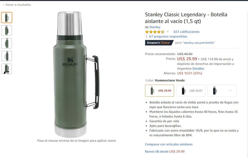 Los termos Stanley, fieles a la tradición matera argentina, son otros de los productos más vendidos. Por un lado, al alto precio y por el otro la poca disponibilidad, es lo que empuja a los consumidores a optar por traerlos desde el exterior.