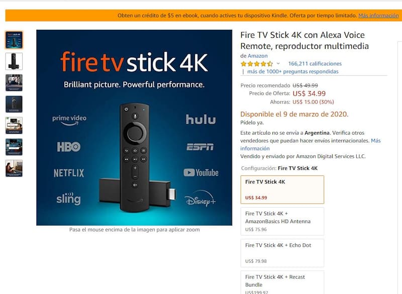 El Amazon Fire TV stick es un dispositivo que permite a cualquier televisor convertirs en una máquina de streaming. En este caso, que soporta varios servicios como Netflix o Youtube y, además, integra la resolución 4K. Se consigue por la módica suma de US$ 30 en el sitio de Amazon.