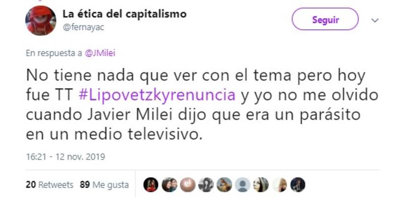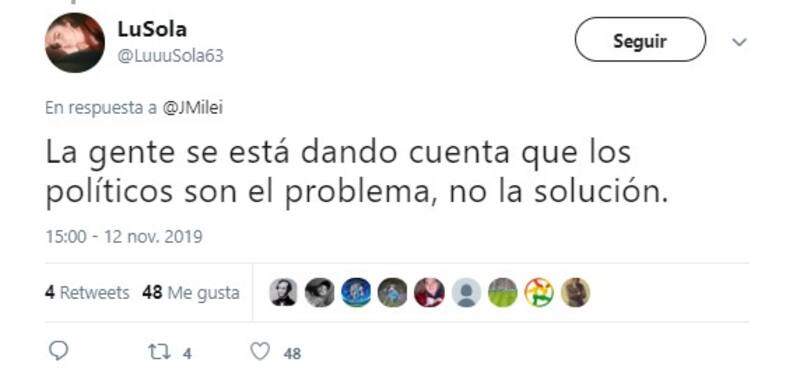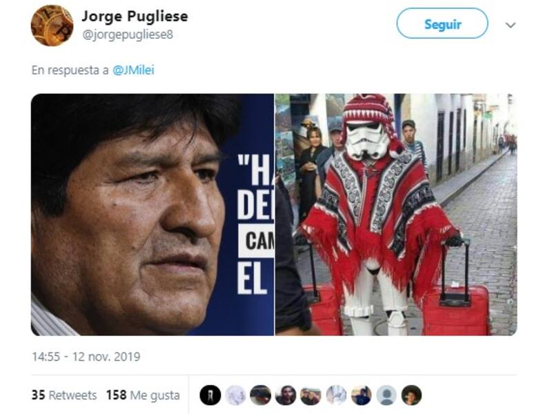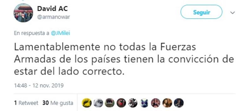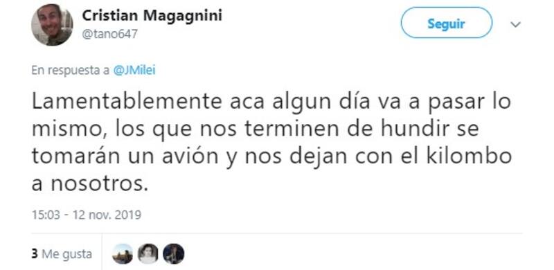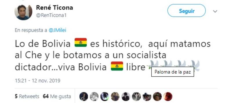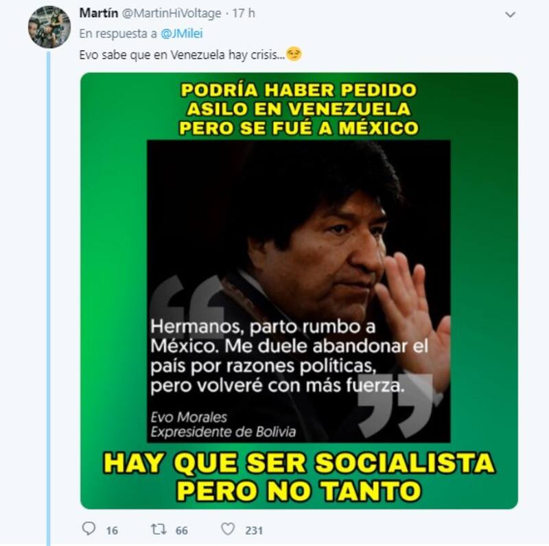 En ese contexto, el economista liberal Javier Milei aprovechó su cuenta personal de Twitter (@JMilei) para brindar su opinión respecto a la salida de Evo Morales de la presidencia.