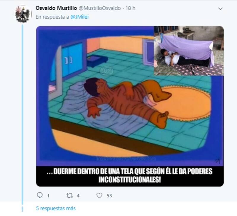 En ese contexto, Milei definió como “justicia poética lo ocurrido en Bolivia y aseveró que los “políticos caerán como moscas frente a la furia del pueblo si las fuerzas de seguridad le quitan su apoyo.