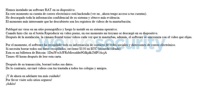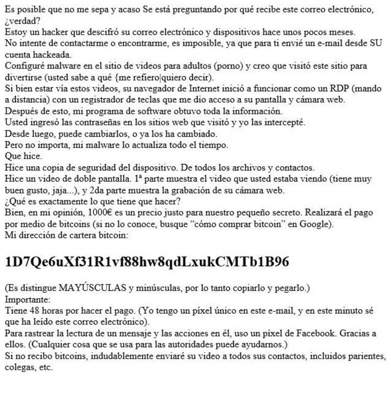 Ya desde hace un tiempo están aumentando su presencia una serie de correos electrónicos ligados a una práctica conocida como "sextorsión", que consta de chantajear a las víctimas usando presuntos asuntos sexuales ligados a su actividad en la web. Los correos que circulan ahora afirman que el destinatario fue hackeado y se grabaron videos de sus actividades frente a la computadora. Lo más sorpresivo es que en el asunto del correo se muestra la contraseña verdadera del usuario. Sin embargo, todo se trata de un engaño pensado para que los usuarios paguen un rescate por un material inexistente.