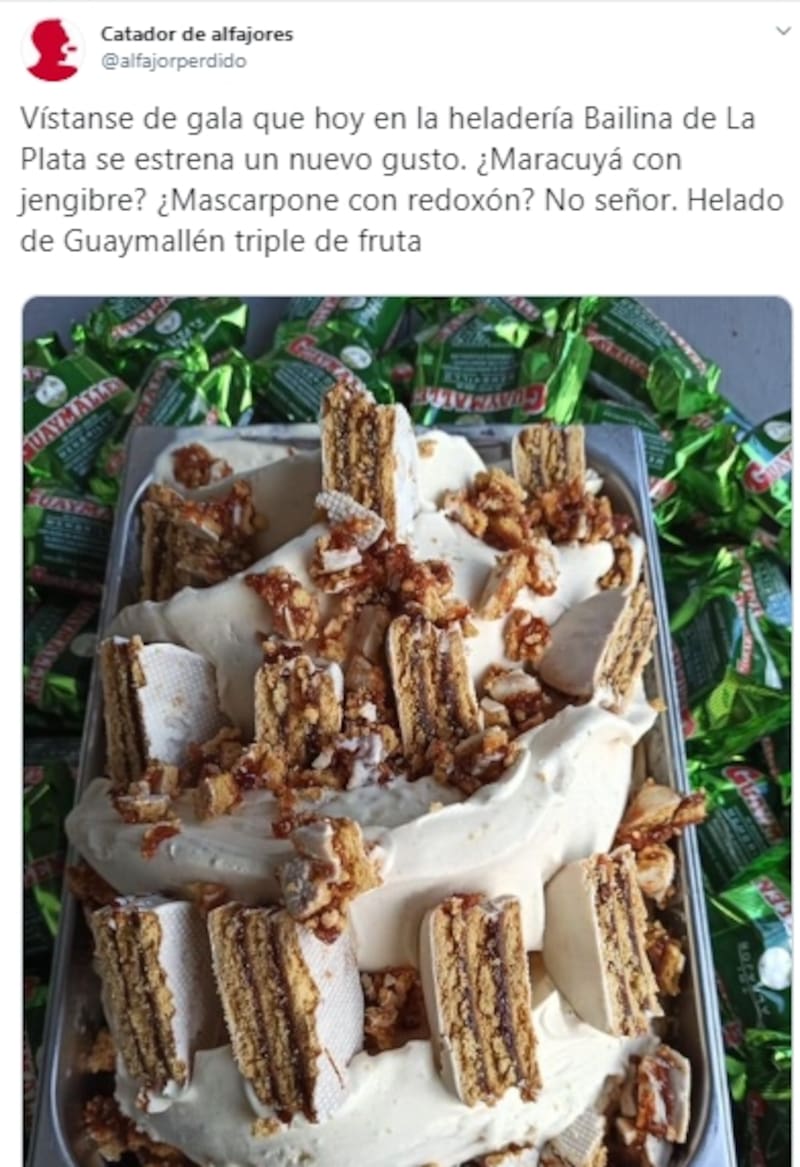 “Vístanse de gala que hoy en la heladería Bailina de La Plata se estrena un nuevo gusto. ¿Maracuyá con jengibre? ¿Mascarpone con redoxón? No señor, Helado de Guaymallén triple de fruta , destacó en el posteo.