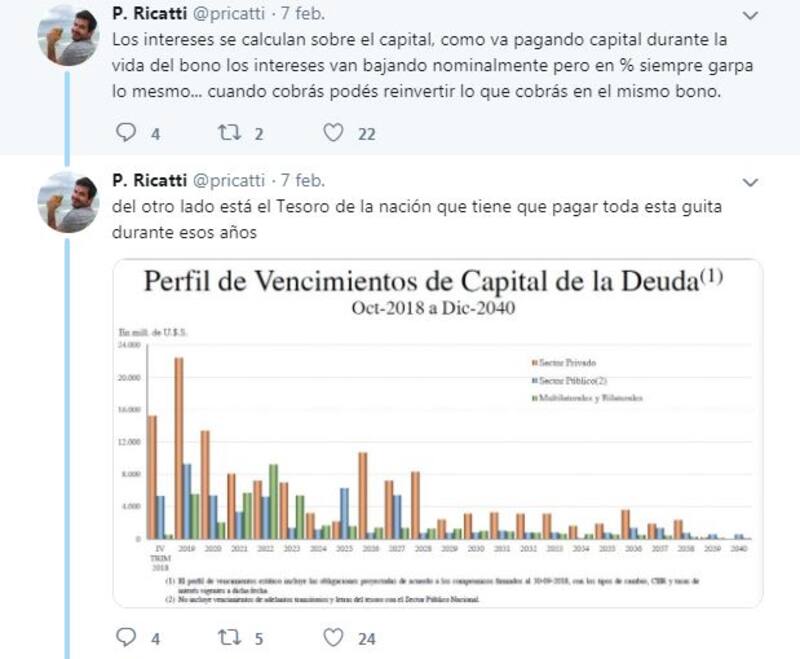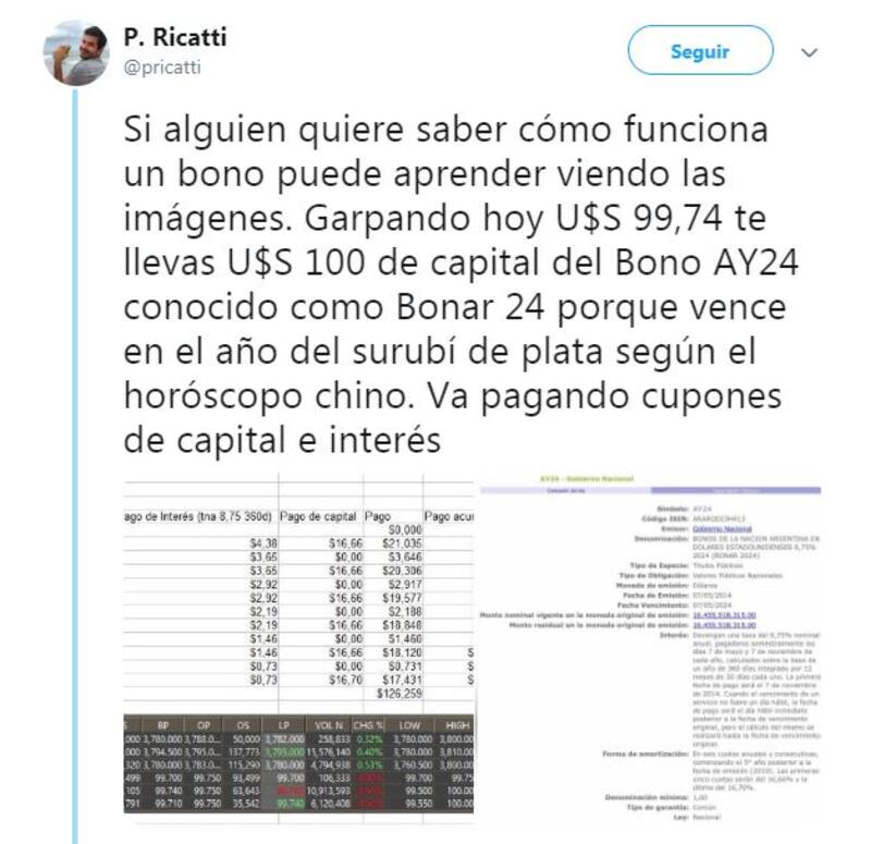 Un nuevo hilo de Twitter del experto en finanzas de las redes, Pablo Ricatti, volvió a volverse viral. En este caso, el empresario explicó todos los secretos de los bonos. Sus más de 17.000 seguidores agradecieron el trabajo de divulgación y los retuits, comentarios y "me gusta" que acompañan la publicación así lo atestiguan.
