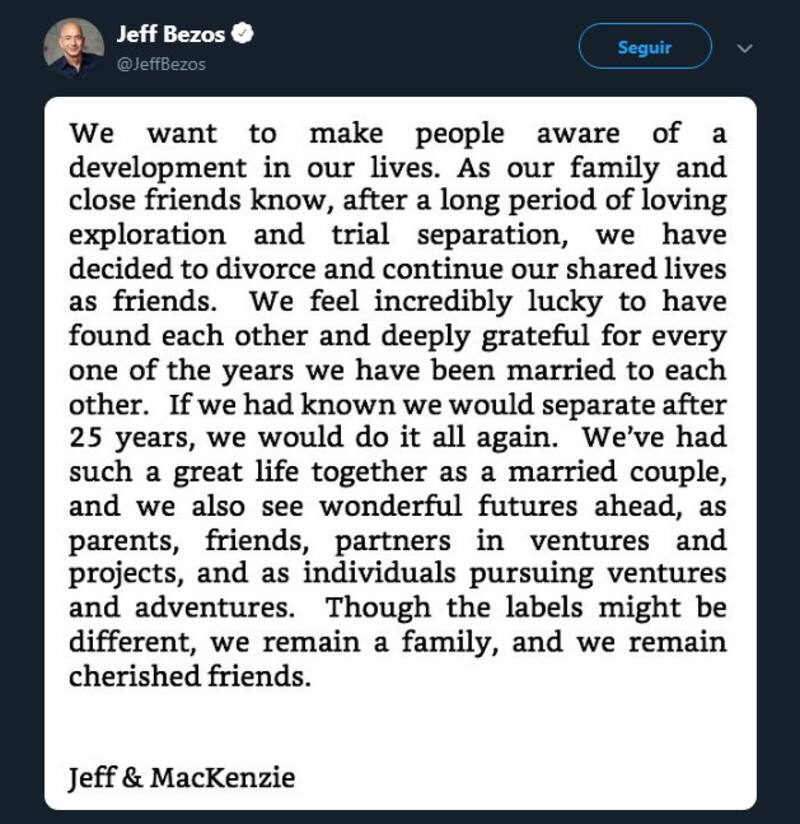 En su cuenta personal de Twitter, el emprendedor posteó: “Queremos que la gente conozca cómo transcurren nuestras vidas. Como nuestras familias y nuestros seres queridos saben, y después de un largo periodo de exploración, en el que hemos probado a separarnos, hemos decidido divorciarnos y continuar nuestras vidas por separado, como amigos .