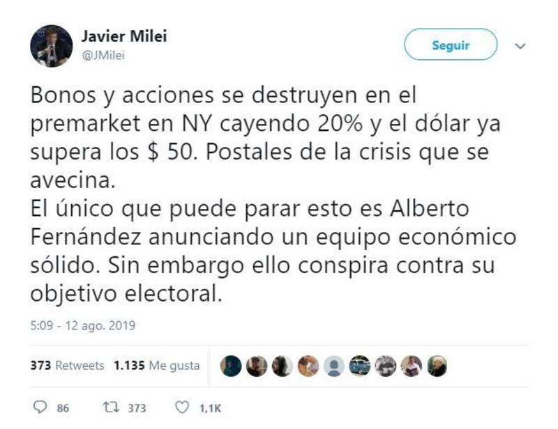 Luego de conocerse el resultado de las PASO, el economista libertario Javier Milei advirtió: "Bonos y acciones se destruyen en el premarket en NY cayendo 20% y el dólar ya supera los $50. Postales de la crisis que se avecina". Así lo expresó el lunes posterior a los comisios preliminares.