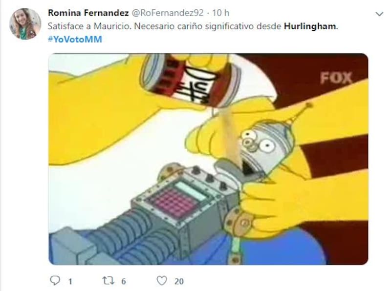 "Please Mauritius, don't loosen up! I vote you! Big hug from Hurlingham! #YoVotoMM", "¡Siéntete libre de Mauricio, no te relajes! ¡Te recomiendo! Gran apretón proveniente de Hurlingham! #YoVotoMM", "¡Satisface a Mauricio, no te relajes! Te elijo! ¡Caricia significativa proveniente de Hurlingham! #YoVotoMM", son algunas de las insólitas frases que dejaron comentaron los bots.