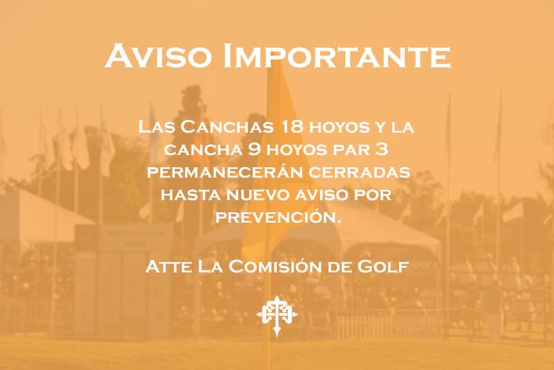 Las instalaciones de Golf, asi como La Cancha 18 Hoyos, La Cancha 9 Hoyos Par 3, Driving, Putting & Chipping, permanecerán cerradas hasta nuevo aviso por prevencion.